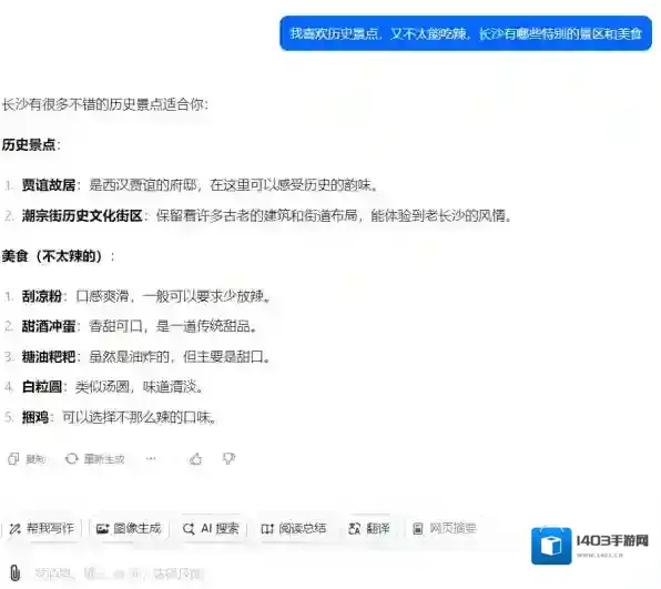 3,不只是单纯的为你搜索信息,豆包还可以根据你的问题制定量身打造的个性化回复,比如你可以继续追问“我喜欢历史景点,又不太能吃辣,长沙有哪些特别的景区和美食”,豆包就会根据这个问题给出贴心的回答。