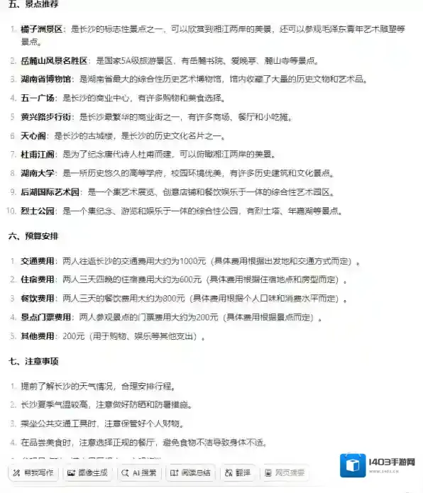 2,比如说向豆包提问“去长沙需要注意哪些地方,预算2000给我一个三天四晚的两人出行方案,包括交通,住宿,美食,景点推荐”,只需要等待几秒钟,豆包就能给出一份详细的长沙旅游攻略。