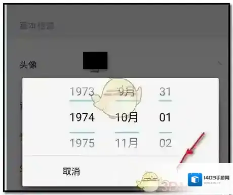 弹出设置年月日的框,在年这里手指上下划动把要选择的年划到中间,两条蓝色横线的中间位置即可选择年份;月和日同样操作选择。然后点确定即可。
