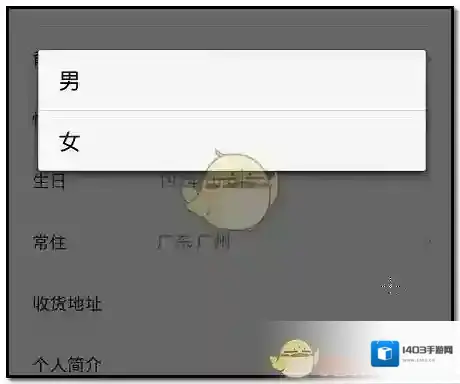 再设置其它的个人信息;比如,性别,在“我的资料”页面,点下“性别”,弹出对话框,显示“男”和“女”,点选即可。