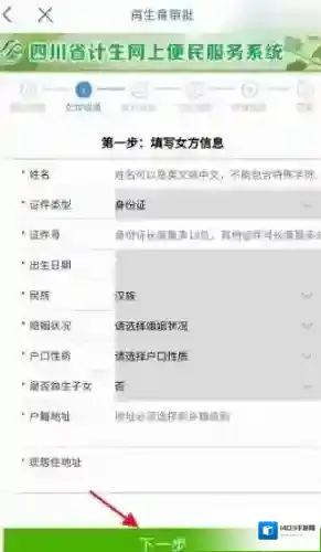 6、进入再生育审批,填写页面,添加相关信息,点击下一步进行申请,根据页面提示操作即可。