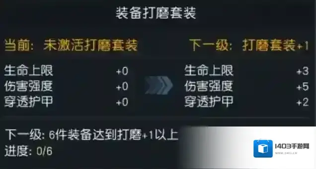 值得一提的是,打磨系统还有套装效果,当一套装备达到一定的等级后即可激活,除了一级打磨之外,每三级都会激活新的打磨套装效果,打磨套装效果有额外的生命上限、伤害强度一级穿透护甲数值加成。