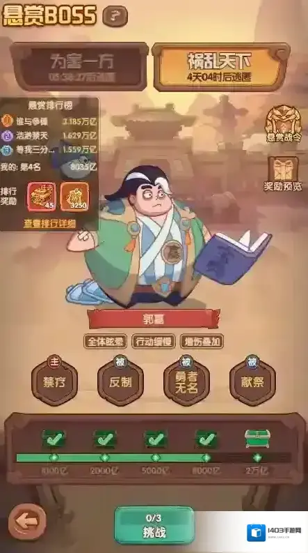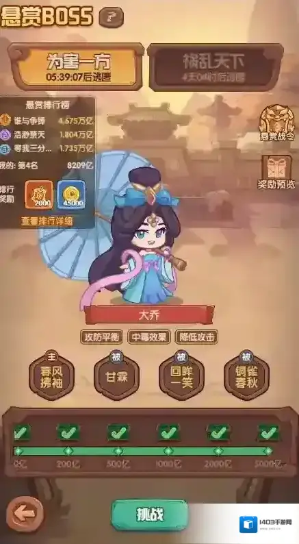 3.悬赏boss可以打出较高伤害,比自己高几十e的大佬还打的多,另外推荐把吕蒙换成诸葛亮,长线战斗中诸葛亮给的加伤会更多,能打出更高伤害