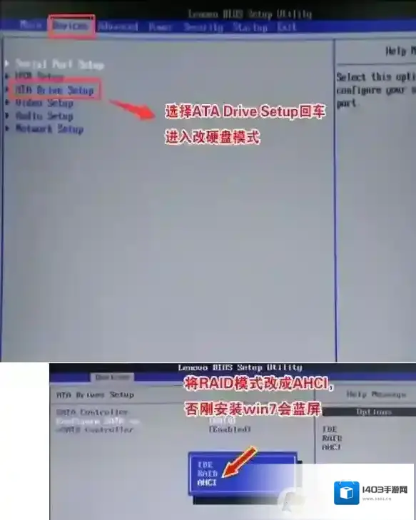 4、切将键盘移动Devices选项,把键盘移动ATA Drive Setup回车,将configure SATA as中默认的raid改成ahci模式,否则安装win7时会出现0x0000007b蓝屏,因为win7中没有集成raid硬盘驱动,然后选择F10保存设置,在弹出的选项中选择YES,如下图所示;