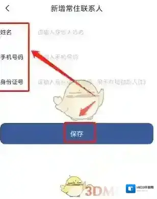 4、进入新增常住联系人,输入姓名、手机号码、身份证号,点击保存。