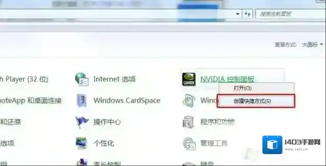 4、或者直接在控制面板处右键选择添加快捷方式,这样桌面就会有一个nvidia控制面板的快捷方式了