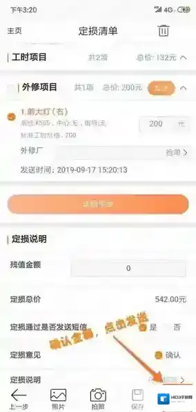 2、点选外修的配件,需要在定损页面发送外修,并在对应的配件外修照片栏目上传配件所示照片。