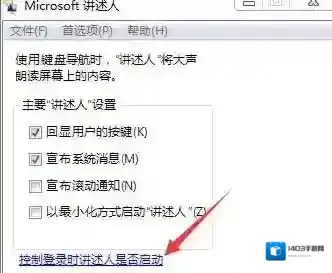 6、此外还可以设置控制登录时讲述人是否启动,点击窗口上面的蓝色文字“控制登录时讲述人是否启动”;
