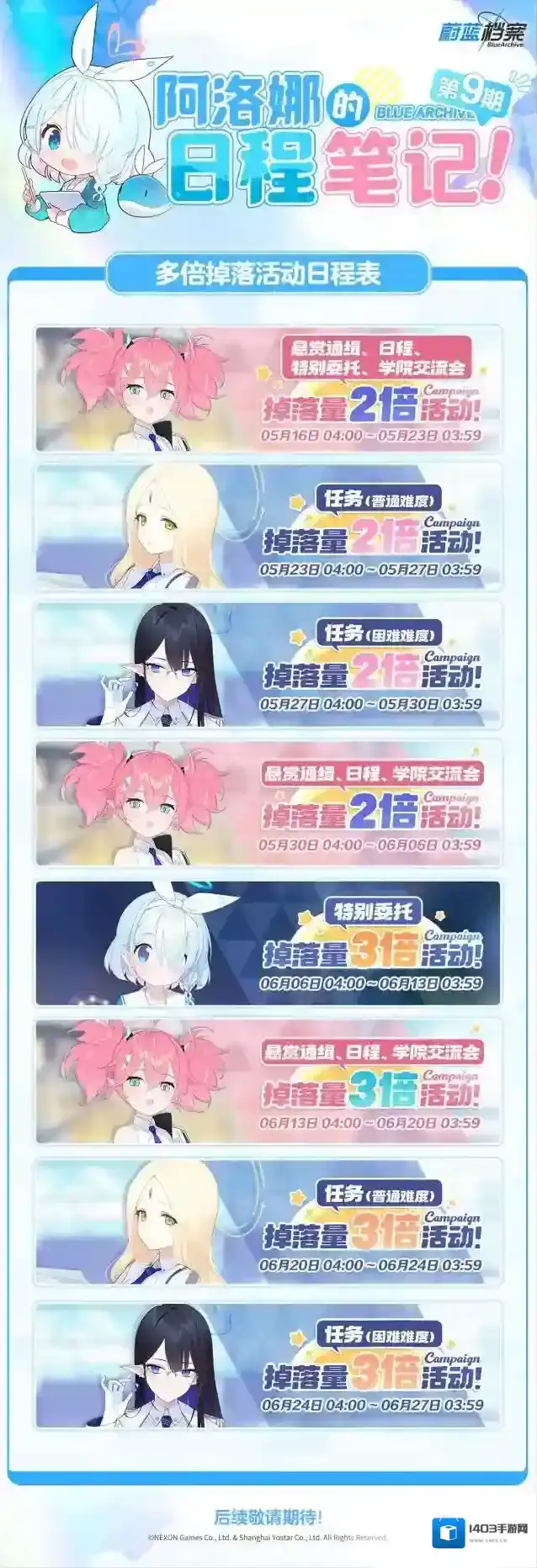 06月19日(悬赏通缉、日程、学院交流会道具掉落量3倍活动期间)每天将通过邮件发放3种悬赏通缉挑战券×2、3种学院交流会挑战券×2作为多倍活动助力补给邮件,总计发放7天。