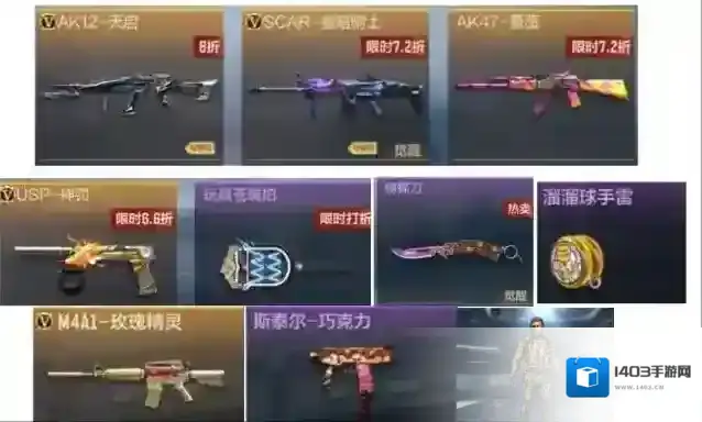 最后,小编再带大家来看看其他的商城折扣商品。其中折扣的武器有:M4A1-玫瑰精灵,AK12-天启,SCAR-幽暗骑士,AK47-蔷薇,USP-神罚,溜溜球手雷,蝴蝶刀,玩具苍蝇拍,斯泰尔-巧克力。折扣的角色为:刀锋队长。