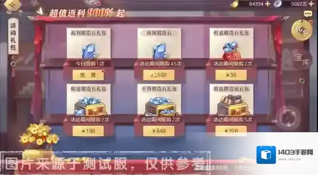 特惠锻造石礼包:含顶级锻造石*5,元宝*300,售价30元,活动期间限购2次。