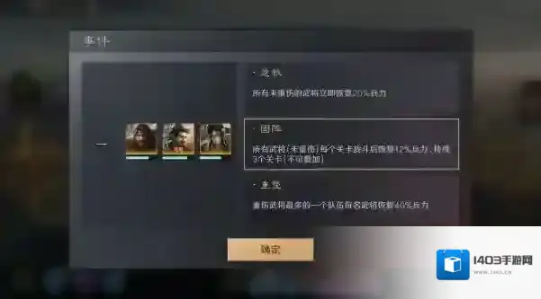 在远征过程中,我们可以通过战胜“恢复兵力”特定关卡,来恢复整个部队的兵力。主公可以酌情按照实际情况是选择当下全体恢复20%,或是单体恢复40%,还是后3场各自额外恢复12%(算上默认恢复3%每场胜利就能恢复15%)。推荐如果没有太多恢复兵力压力,可以选择后3场额外恢复的,毕竟恢复量最多,但是变数也比较多。