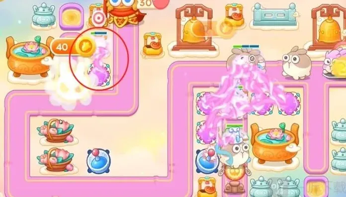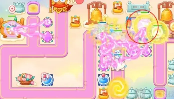 3、中间魔法球打下面篮子,建立雷达,之后打香炉,建立魔法球,第一波留最后一只兔子,打中间障碍物,接着右边魔法球打右边香炉。