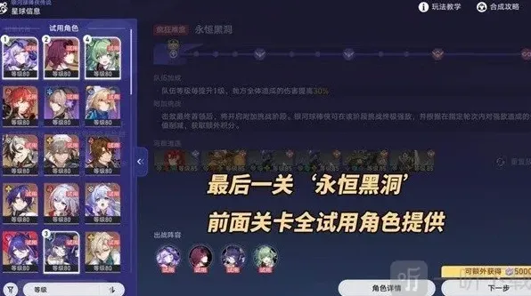 此时将是活动最后一关永恒黑洞,此时将完全自由,初始武器自由选择,并且前5关试用角色全提供!