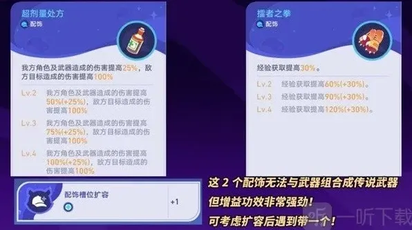 ※升级时除了关卡高亮推荐,也可优先解锁最底部「配饰槽位扩容」,多个空位用于选择非武器组合配饰‘擂者之拳(拳套)每级提升30%经验’或‘超剂量处方(药瓶)每级提升25%角色与武器伤害’。