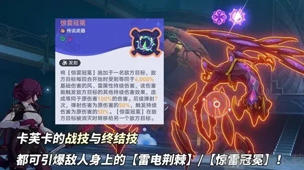 关键点!卡芙卡的战技目标一定要选择带有雷电荆棘效果的敌人,因为此武器描述是敌人行动会引爆,实则卡芙卡的DOT引爆也能触发雷电荆棘效果!全局下来高频次触发,非常爽~