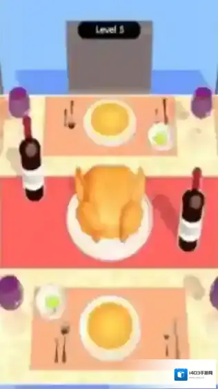 2、画面呈现摆放烤火鸡、餐盘、酒杯、餐具等的餐桌场景,属于休闲益智,玩法围绕按要求布置餐桌、摆放餐食等展开,烤火鸡是西餐常见主菜,常出现在这类模拟布置。