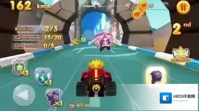2、赛道上,控赛车(3rd),吃加速道具,超粉色/黑色对手,追金币。