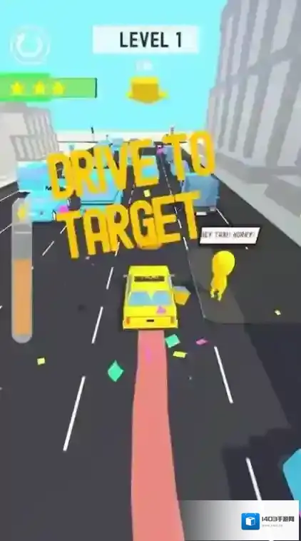 1、LEVEL1,控黄色出租车,沿红路线,避行人,追“DRIVE TO TARGET”目标。