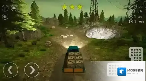 2、用右侧虚拟按键控速,避障碍(石头/木箱),沿山路行驶,保三星,赶时间(01:35)。