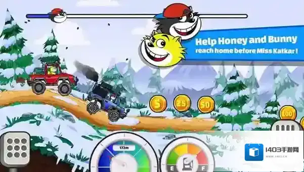 3、沿赛道,吃金币($/25/50),稳控赛车,避障碍,保第一,赢奖励,升赛车性能。