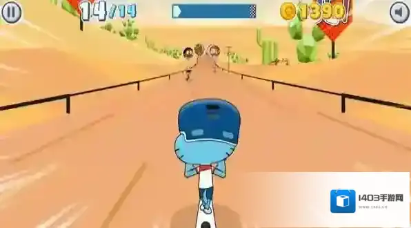 2、赛道跑酷操控戴蓝头盔的角色,在公路赛道滑行,躲避障碍,收集金币(000→015),完成“14/14”关卡目标。