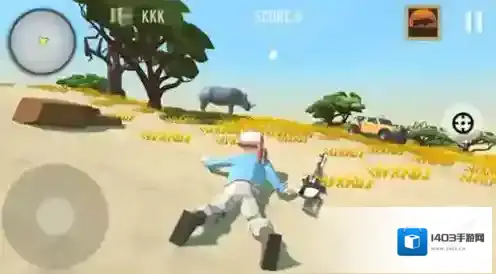 3、躲“犀牛”!被撞倒地,点左侧移动,绕树跑,3秒摆脱,每猎10只,领新枪(狙击+5),分数翻倍。