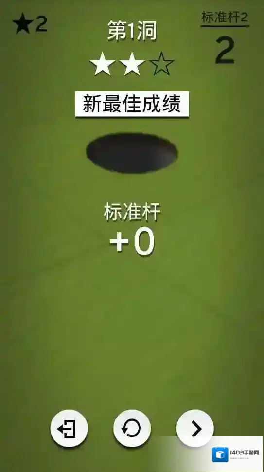 3、成绩结算完成“第1洞”,显示“新最佳成绩”“标准杆+0”,可获星级★2,推进关卡,挑战更多球洞。