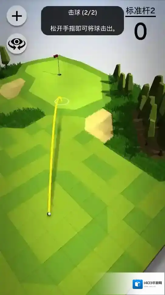 2、击球操作在高尔夫球场,拖动控制击球轨迹(黄色线),松开手指击球,完成击球2/2等步骤,让球进洞。