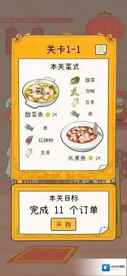 3、备齐酸菜鱼食材,点击开始完成11个订单目标。