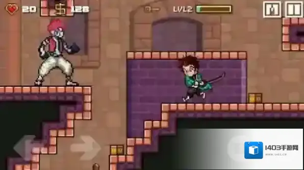 2、左上角显示红心数量为20,货币数量为128,等级标识为“LVL2”,画面中有两个角色,一名持剑的角色准备攻击上方平台的敌人。