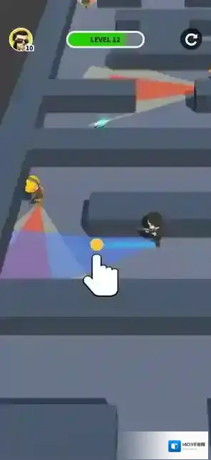 1、指尖拖动移动攻击:通过手指拖动控制角色移动,利用探查半径机制,在进入敌人范围后发起攻击,同时警惕被其他敌人发现。