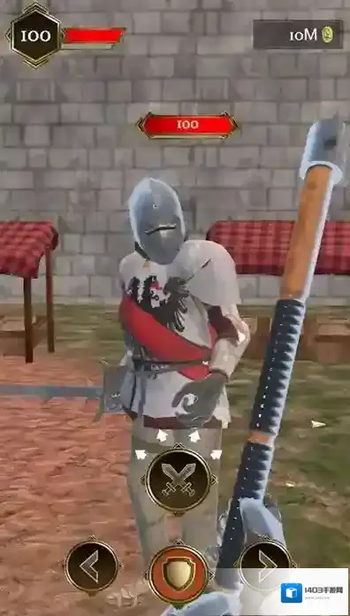 3、画面中有身着盔甲的骑士角色,界面左上角和上方显示血量数值100,下方有攻击、盾牌防御、方向移动等操作按钮,背景能看到石墙、带格子桌布的桌子等场景元素。