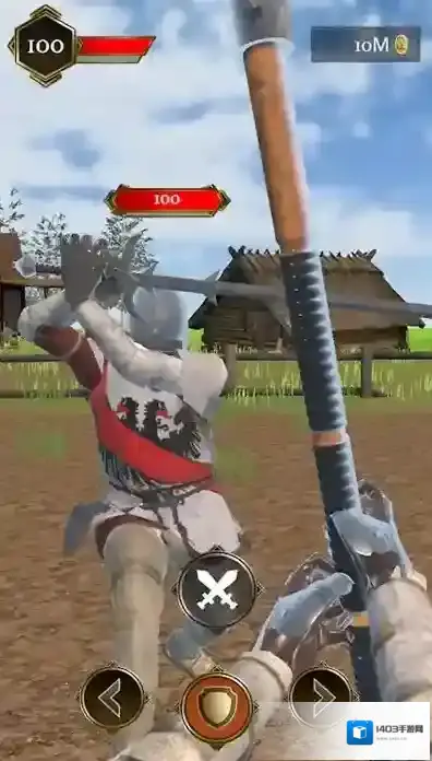 2、画面中显示两名身着盔甲的骑士在对战,上方显示双方血量均为100,下方有操作按钮,包括攻击(交叉剑图标)、盾牌防御(盾牌图标)以及方向移动按钮。