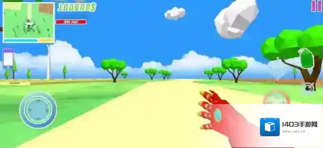 3、呈现了开放沙盒场景,角色装备钢铁侠的手部武器,界面有地图、手雷等元素,属于中玩家操控角色在户外探索战斗的场。