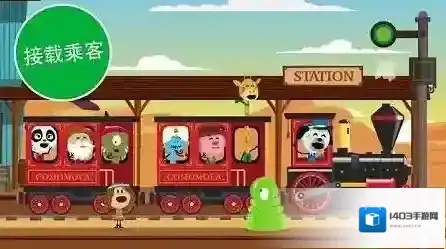 2、进入火车站场景,根据“接载乘客”的提示,让火车停靠在站台边,搭载不同的动物乘客如熊猫、圣诞老人、长颈鹿等上车,完成乘客接载任务。