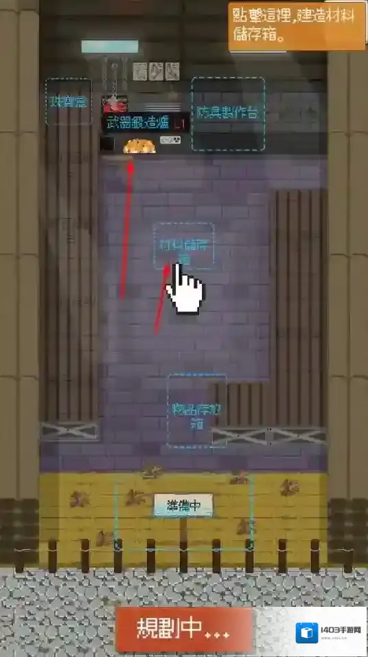 1、“建造工坊”,在工坊区域建造材料储存箱、武器锻造炉等建筑,规划生产布局。