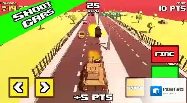 2、在公路场景操控坦克,利用左右箭头按钮转向,“GAS”键加速、“BRAKE”键减速,“FIRE”键射击,需在限时(00:35)内摧毁指定数量车辆(0/5)。