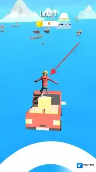 1、在热带海岛的海面上,操控角色首次跳跃,精准落在前方漂浮的木板上。