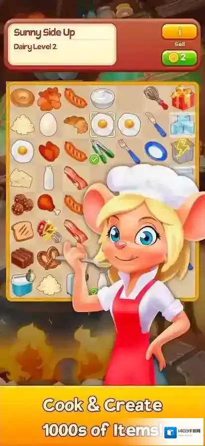 2、拖动两个冰块或其他相同物品进行合并,就能生成新的东西;棋盘上的食材和工具摆放得较为杂乱,种类丰富,等待你去整理与合成。