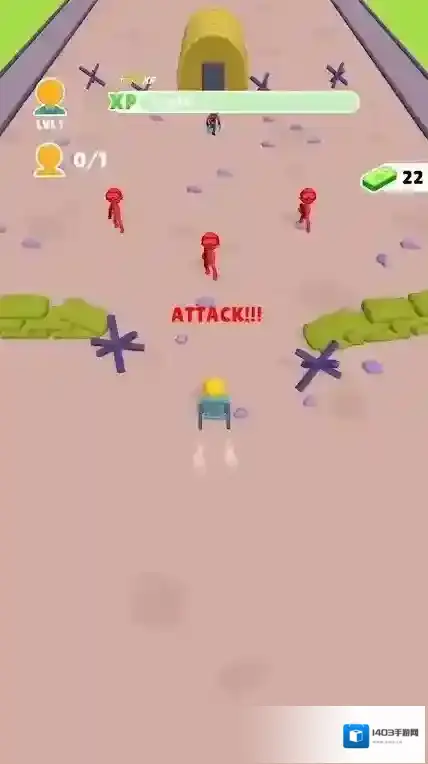 1、玩家操控的角色可能需要攻击红色小人,画面有等级、经验值、收集数量、金币数量等信息,文字“ATTACK!!!”提示进行攻击。
