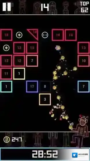 3、冲排名续存挑战:目标是进入前十名,需持续打破砖块并保持生存,通过不断挑战提升成绩,借助物理引擎带来的真实反弹效果,在突破关卡中向更高排名迈进。