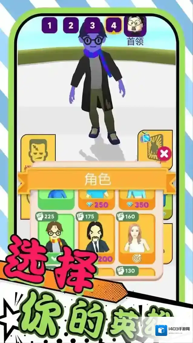 2、进入角色界面后,查看不同角色的属性,选择合适的角色(如箭头指向的戴眼镜角色),花费对应货币解锁并替换,增强角色实力。