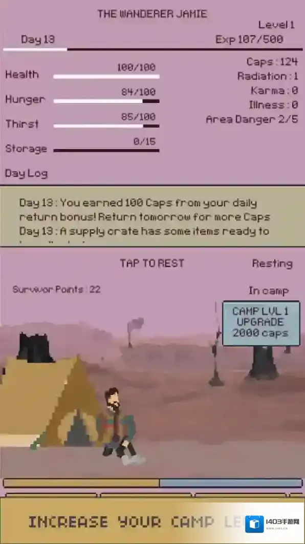 3、在营地,点击休息到第二天,恢复状态,推进Day1进程,积累Survivor-Points,发展角色。