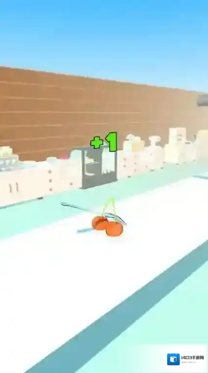 2、叉子成功接住蛋糕,继续沿轨道前行,过程中留意“+1”标识区域,引导叉子经过该区域,收集增益效果,助力后续跑酷闯关。