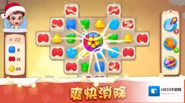 1、三消闯关策略操作:滑动消除同色元素完成任务,合理利用道具组合清场,在限定步数收集物品推进剧情。