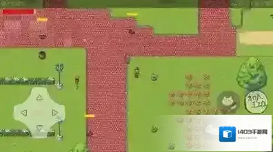 3、呈现角色(像素人物)、场景(草地、树木、道具木桶)、操作按键等,是角色在场景互动、探索的界面,玩家可操控角色移动、互动,开展生存或冒险玩法。