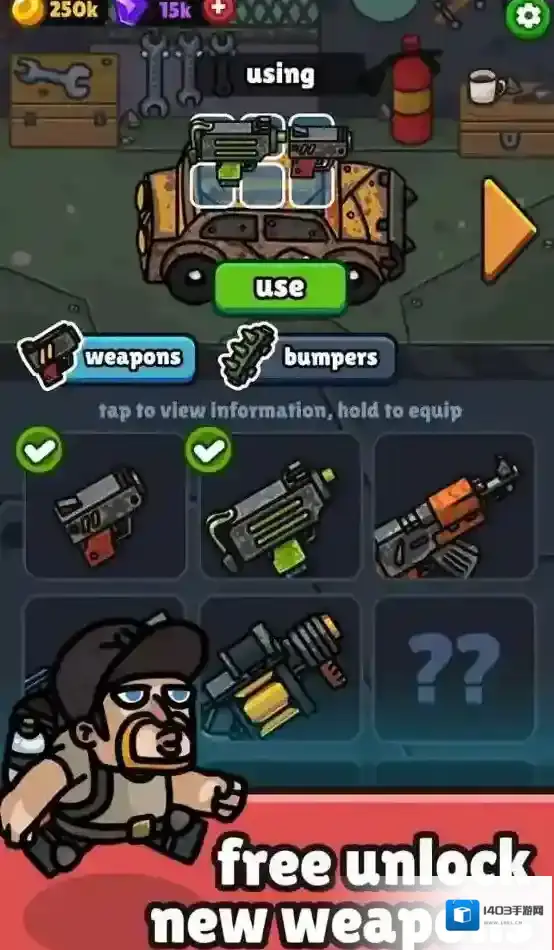 3、消耗金币可以升级你的车辆,可以提升武器威力或者增加血量。