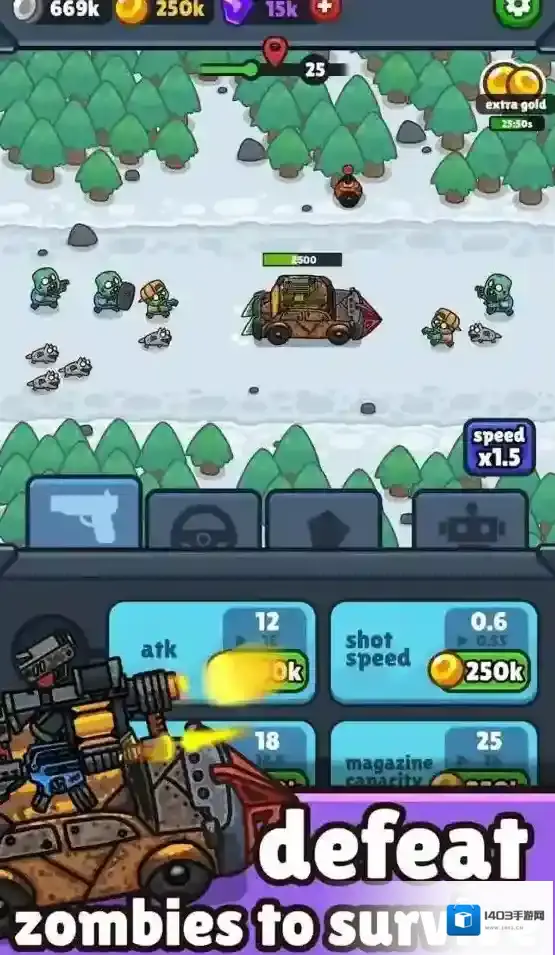 2、进入关卡后车辆会自动攻击僵尸,击败僵尸可以获得丰富奖励。