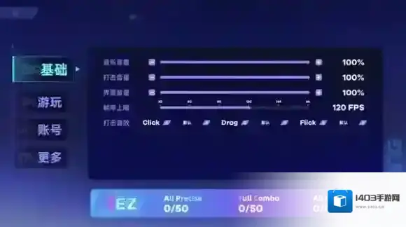 4、在设置面板中可自定义音乐音量、帧率上限及打击音效等参数。